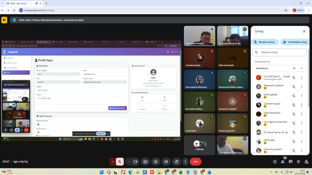Cirebon, 21 November 2025 — Program Pendidikan Jarak Jauh Sejarah Peradaban Islam (PJJ SPI) turut menghadiri acara Peluncuran Aplikasi SapaFUA, sebuah inovasi layanan digital yang dikembangkan oleh Fakultas Ushuluddin dan Adab (FUA) UIN Siber Syekh Nurjati Cirebon untuk meningkatkan kualitas layanan akademik dan administrasi di era siber. Kegiatan Peluncuran Aplikasi SapaFUA ini dilaksanakan secara daring melalui platform Google Meet dan dipimpin langsung oleh Dekan Fakultas Ushuluddin dan Adab, Dr. H. Anwar Sanusi, M.Ag.
